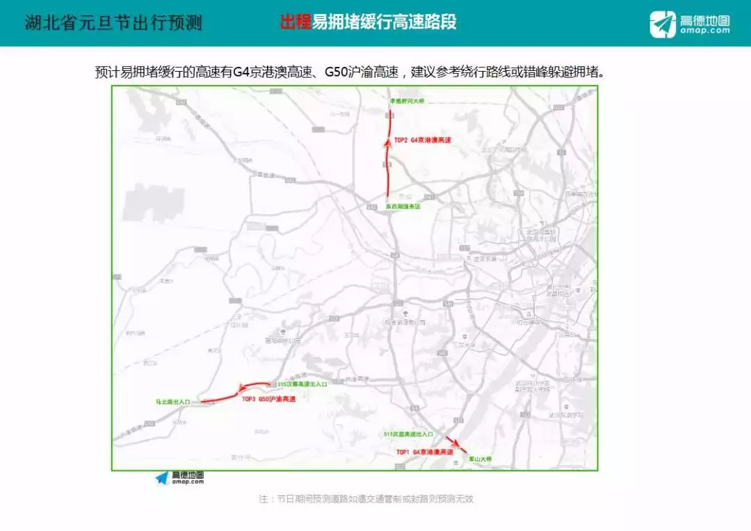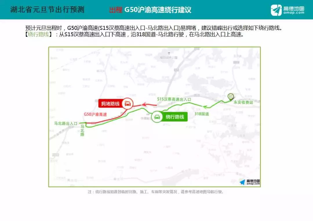 预计元旦出程时,G50沪渝高速(S15汉蔡高速出入口-马北路出入口)易拥堵,建议错峰出行或选择如下绕行路线。