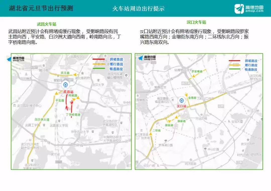 汉口站附近预计会有拥堵或缓行现象, 受影响路段罗家嘴路西南方向;金墩街东南方向;二环线东北方向;振兴路东南双向。