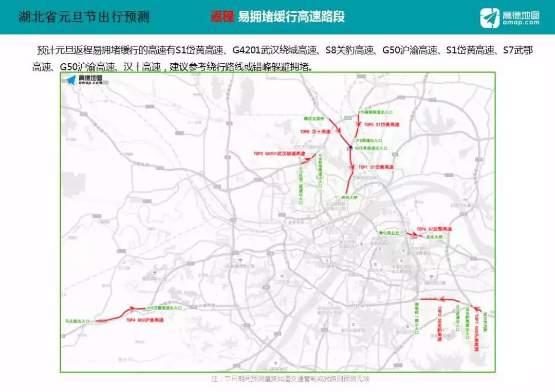 预计元旦返程易拥堵缓行的高速有S1岱黄高速、G4201武汉绕城高速、S8关豹高速、G50沪渝高速、S1岱黄高速、S7武鄂高速、G50沪渝高速、汉十高速,建议参考绕行路线或错峰躲避拥堵。