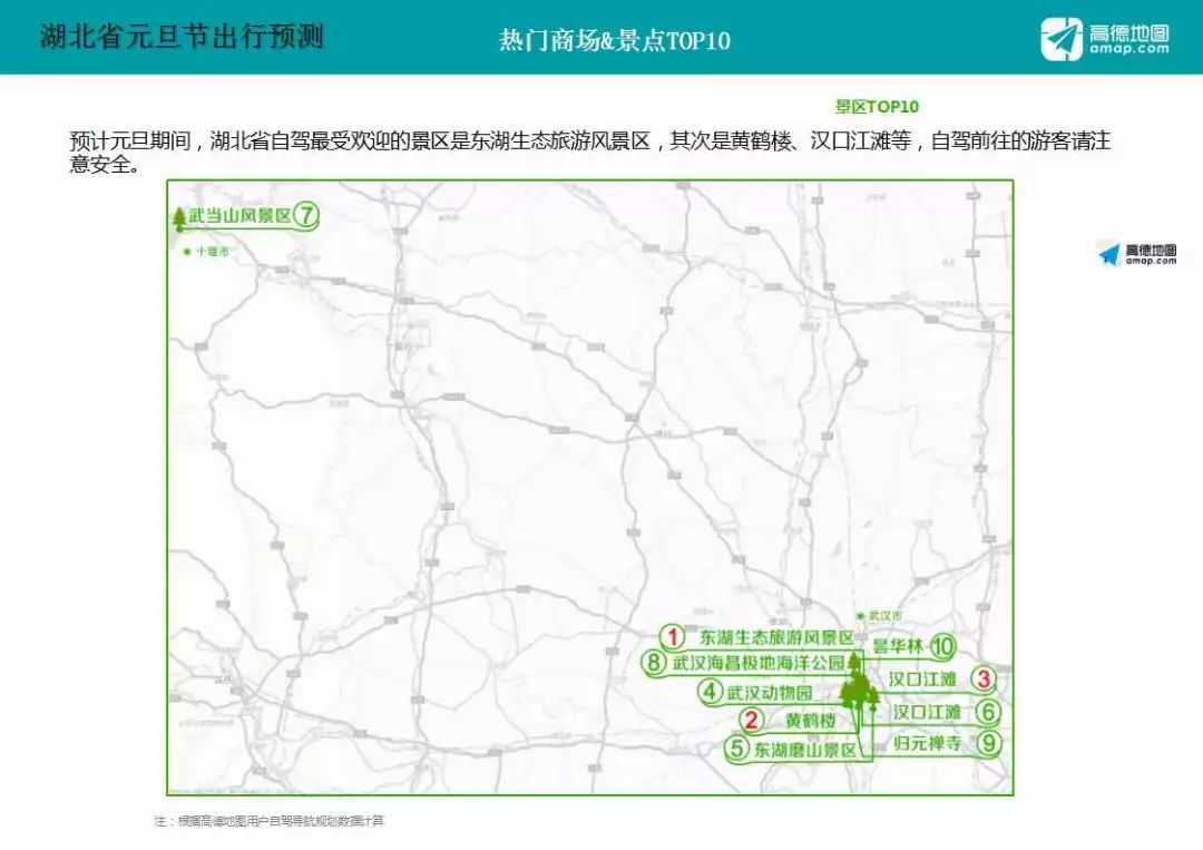 自驾游热门景点预计有:东湖生态旅游风景区、黄鹤楼、汉口江滩、武汉动物园、东湖磨山景区、梨园广场、武当山风景区、武汉海昌极地海洋公园、归元禅寺、昙华林;自驾热门商场预计有:百联奥特莱斯广场(武汉·盘龙)、永旺梦乐城(经开店)、武汉国际广场、光谷国际广场、万达广场(经开店)、武汉海宁皮革城、万达广场(菱角湖店)、黄陂广场、销品茂、群光广场
