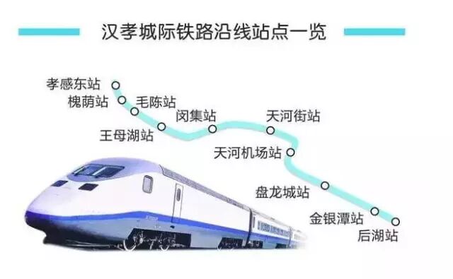 记者在汉口火车站了解到,武孝城际铁路从汉口火车站引出,终到孝感东站,全长61.3公里,设计速度200km/h。开通运营前期,沿途设后湖、金银潭、盘龙城、天河机场、天河街、闵集、毛陈、槐荫、孝感东等9个车站,后期预留王母湖车站,其中天河机场站、孝感东站可以办理列车始发、终到业务。
