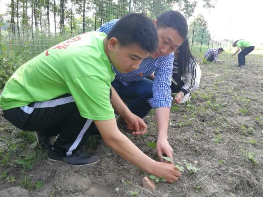 在阳光家园农疗康复基地田间地头,孩子与党员志愿者一起锄草