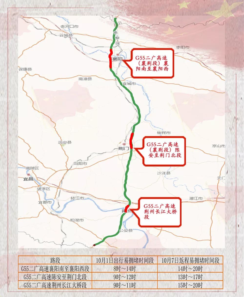 省高管局相关人士介绍,国庆期间,我省境内最易拥堵路段主要为:武汉圈环线,京港澳高速蔡甸至武汉北段,福银高速孝感至云梦段和孝南互通,二广高速襄阳南至襄阳西段、陈安至荆门北段、荆州长江大桥段,沪蓉高速东西湖至汉川段,沪渝高速永安至仙桃段、长阳至恩施段。