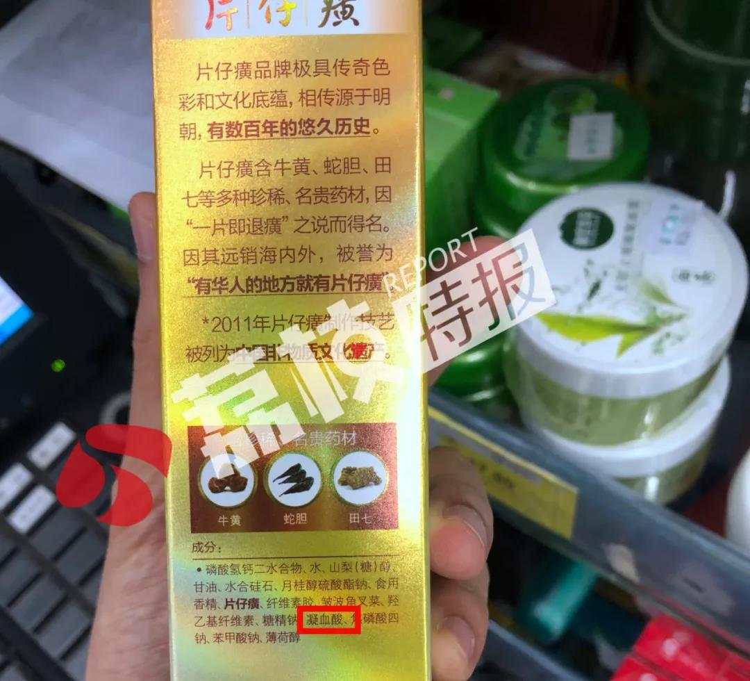 记者今天上午走访南京多家超市看到,云南白药牙膏多款产品的成分表中,都标明了“氨甲环酸”。据了解,“氨甲环酸”又名凝血酸,主要有止血、美白等作用。记者还发现,另一款名为“片仔癀”的中药牙膏,其成分也含有“凝血酸”。就该问题,云南白药集团工作人员回应称:“我们没有欺骗消费者的意思,如果欺骗消费者,它上面肯定不会标这个成分,(我们)并没有隐含成分,而且信息都是公开。它里面主要是含有云南白药的药物活性成分,主要是这个来帮助减轻牙龈问题的”。
