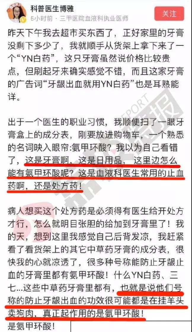 10月21日,网名为“科普医生博雅”的网友发表文章称:云南白药牙膏中含有止血功效的西药成分“氨甲环酸”,而不是云南白药,这些所谓防止牙龈出血、止血的“中药牙膏”,其实都是在挂羊头卖狗肉,起到真正作用的,是西药“氨甲环酸”。“科普医生博雅”还质疑,氨甲环酸是处方药,添加到日用品中可能涉嫌违法添加。