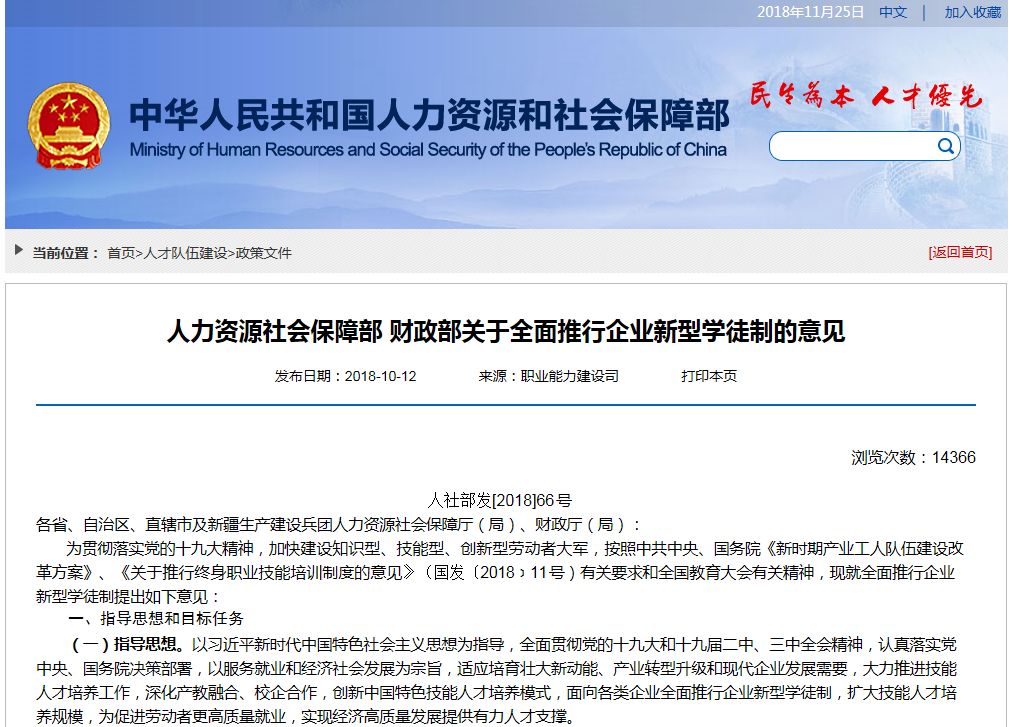 日前,人社部、财政部共同印发《关于全面推行企业新型学徒制的意见》。跟小编一起来看看,国家对企业新型学徒制的支持!
