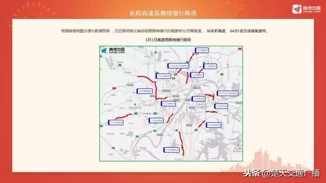根据高德地图交通大数据预测,元旦返程高峰高速易拥堵缓行时段如下,建议行驶到以下路段的车主时刻注意路况,及时躲避拥堵。