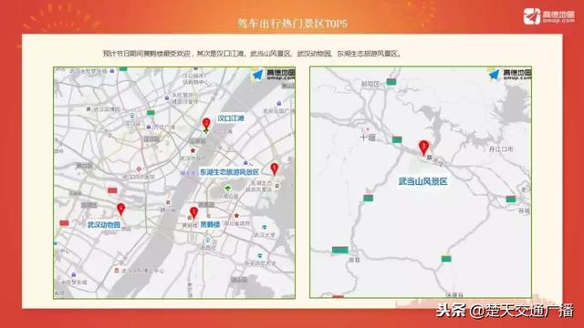 预计节日期间黄鹤楼最受欢迎,其次是汉口江滩、武当山风景区、武汉动物园、东湖生态旅游风景区。