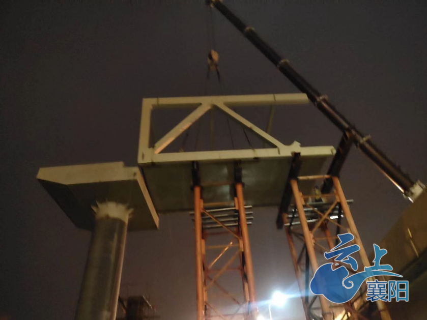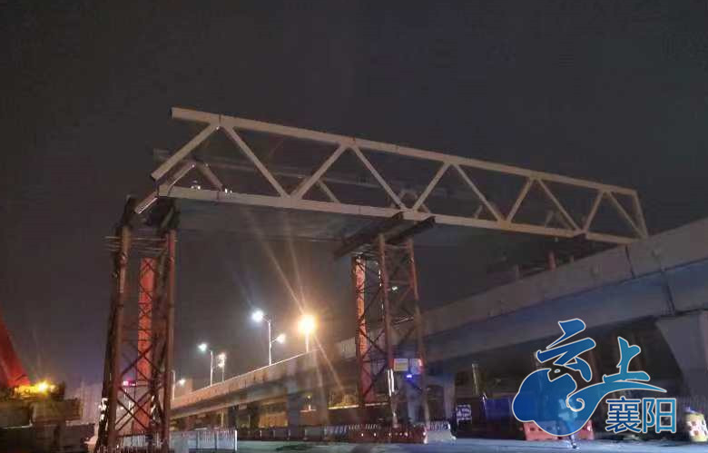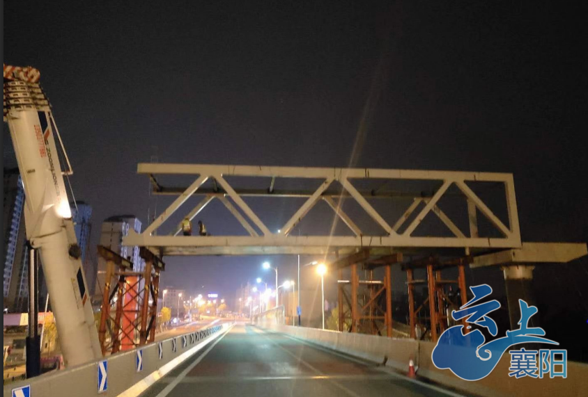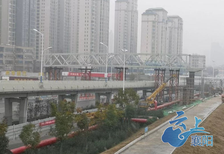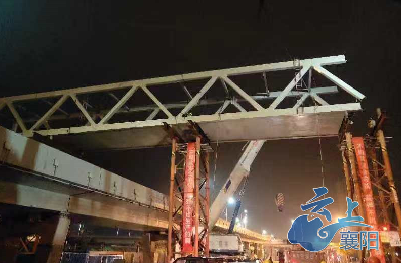 今天上午,记者在樊城人民西路三桥下方看到,一段横跨人民西路和三桥下桥匝道的桁架桥已经架装到位,施工人员正在做焊接前的准备工作。
