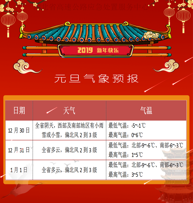 根据最新气象资料分析,预计2019年元旦假期(2018年12月30日~2019年1月1日)受冷空气持续南下影响,我省气温较低,其中,12月30日我省部分地区有雨雪天气发生;2018年12月31日~2019年1月1日,天气转好,早晨气温将降至北部-9到-6℃、南部-6到-3℃。