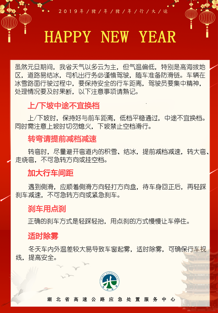 为保障元旦假期我省高速公路路网安全平稳有序,湖北省交通运输厅高速公路管理局根据历年小长假出行特点为社会公众提供出行预判及建议,具体如下: