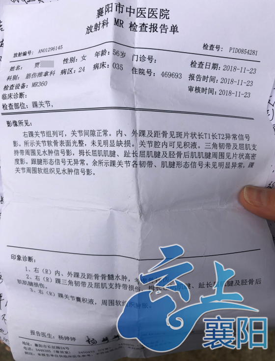“说是软组织挫伤了,骨积水。医生说,如果是走平路受伤只会伤到一个脚锁骨,只有手按着脚后跟才能同时伤到两个脚锁骨。”按摩店会员贾女士说。