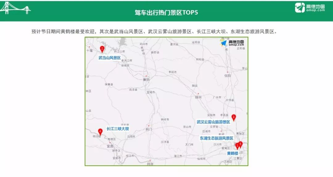预计节日期间黄鹤楼最受欢迎,其次是武当山风景区、武汉云雾山旅游景区、长江三峡大坝、东湖生态旅游风景区。