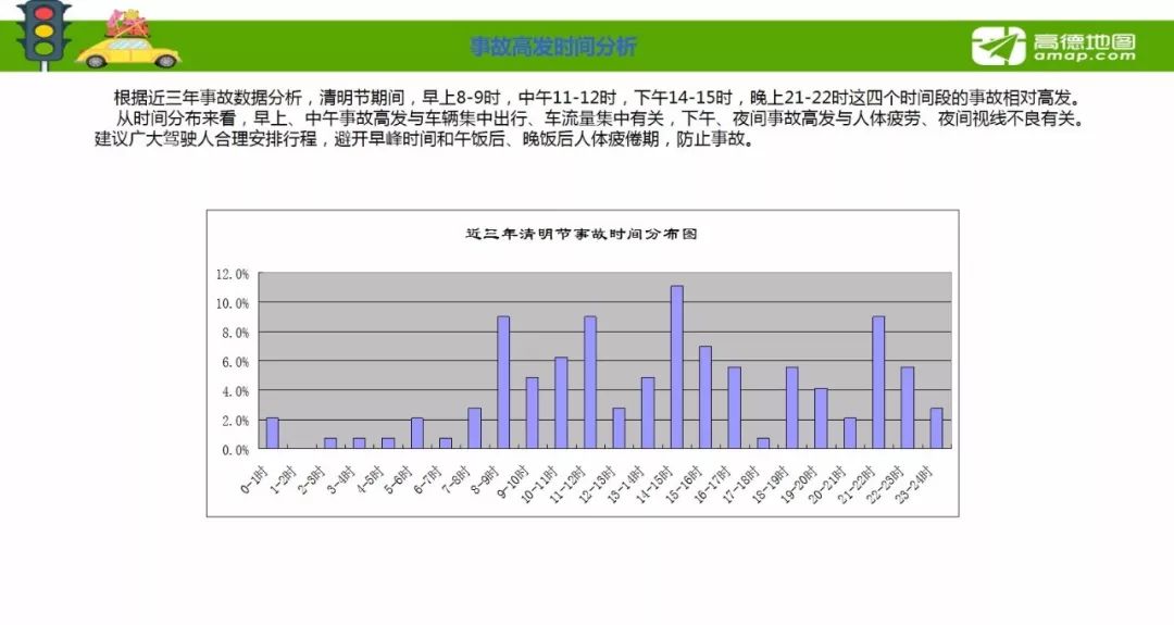 根据近三年事故数据分析,清明节期间,早上8-9时,中午11-12时,下午14-15时,晚上21-22时这四个时间段的事故相对高发。