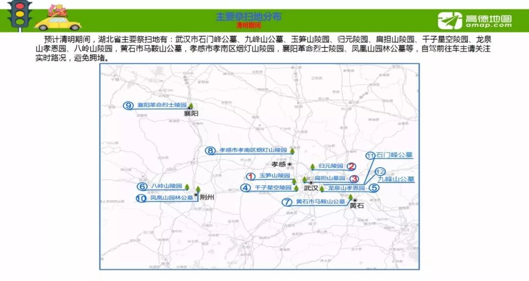 为保障群众清明节假期平安出行,湖北省公安交通管理局联合高德地图发布《2019年湖北省清明节出行提示》。根据大数据分析和近年清明节出行特点,湖北交警提醒广大交通参与者注意安全、小心驾驶,及时避开拥堵路段,错时错峰出行。