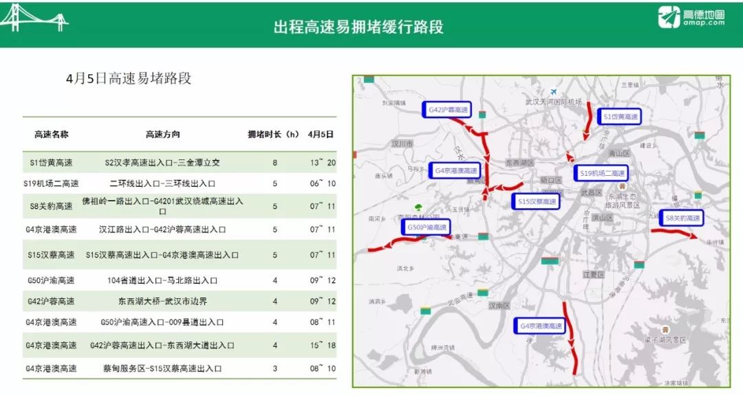 S8关豹高速:佛祖岭一路出入口-G4201武汉绕城高速出入口,拥堵时间为7点至11点。