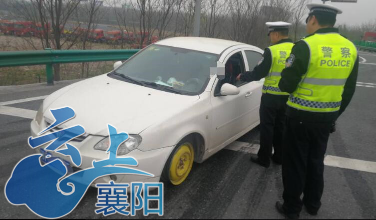 29日上午九点多,在福银高速襄阳北收费站一辆白色轿车缓缓驶下高速,在此值勤的交警发现这辆车怎么看怎么觉得不对劲,然后再仔细一看,发现这个车的左前轮连轮胎都没有,只剩一个钢圈,钢圈和地面摩擦发出刺耳的声响,民警赶紧将该车拦停。