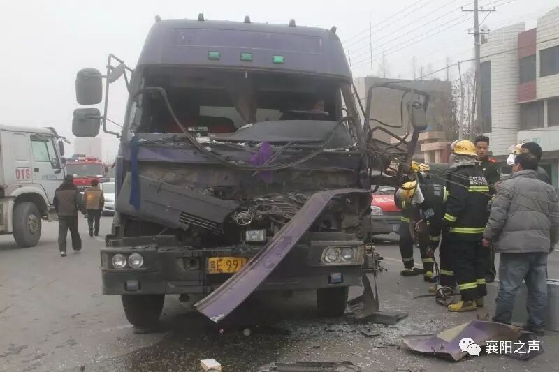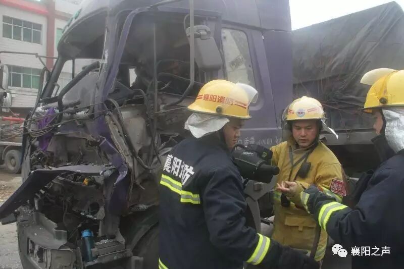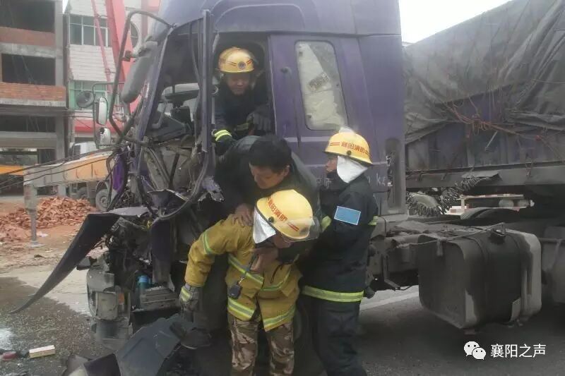 18号上午11点半,襄州区古驿镇国道加油站旁边一辆半挂车追尾另一辆半挂车,追尾货车上有一人被困,急需救援。襄州消防中队接警后迅速奔赴现场救援。