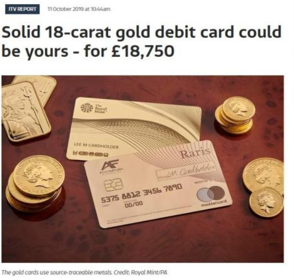 ◆ 日前,英国皇家铸币局在其官方网站上宣布,推出了首张纯金借记卡。声明称,此卡售价约1.87万英镑。