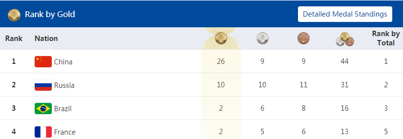 ◆第七届军运会两日赛程,中国以26金,9银,9铜暂列第一。俄罗斯、巴西、法国分列二、三、四名。