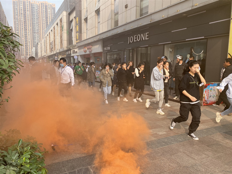 位于万达广场一楼大厅发生火灾,由于内部消防设施失效,从而导致了火势迅速沿通道向四周蔓延。“火情”发生后,万达广场管理中心立即按照灭火应急预案,迅速启动应急广播和自动灭火设施,组织人员疏散被困人员和贵重物资,并拨打119报警电话。万达专职消防队立即出动赶赴现场。经过近10分钟的协同作战、密切配合,成功救出被困人员,并将“大火”扑灭,演练取得圆满成功。随后,宣传员还详细为参加疏散实战演练的员工及过往的行人讲解了突发火灾的应变、逃生技能、灭火器使用方法及液化石油气初期扑救方法等消防知识,进一步提升了万达从业人员的消防安全知识、事故发生后逃生技巧,同时还掌握了一般灭火器材的操作使用步骤及方法,提高了员工应对火灾突发事件的能力。
