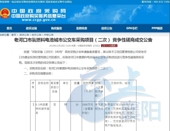 近日,中国政府采购网发布了湖北老河口市氢燃料电池城市公交车采购项目(二次) 竞争性磋商成交公告。公告显示,东风襄阳旅行车公司以1987万元中标老河口市10辆8.5米级氢燃料城市客车采购项目,平均每台单价198.7万元。