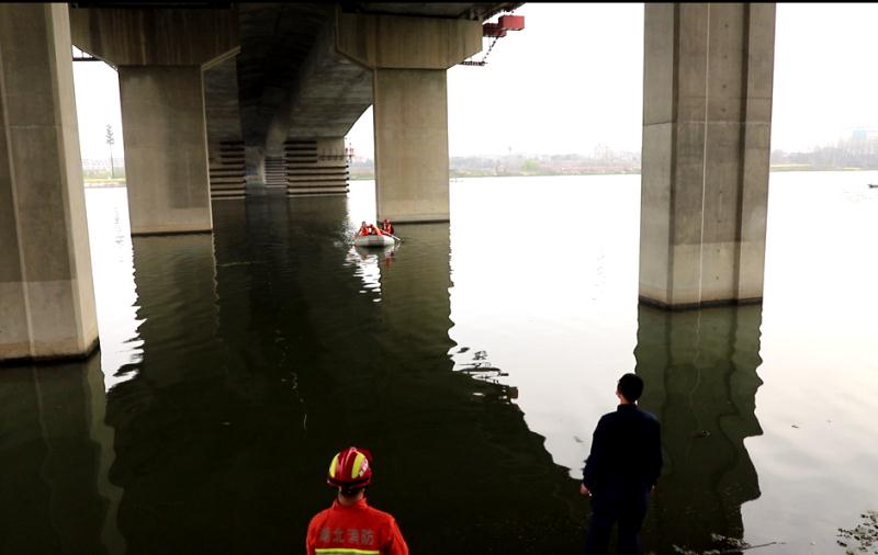 消防人员到达唐白河岸边后,河面上并没有发现被困人身影,据现场民警介绍该被困人员应该距岸边不远,大声呼喊还能听到男子的回声。救援人员迅速架设好橡皮艇,由三名队员穿戴好救生装备,慢慢划向水面深处,边划边询问男子准确位置,划了三十多米距离后,救援人员在一处桥墩背面发现了被困者,他双手抓住一处凸起的钢筋条,身体十分虚弱。消防员迅速靠近,一把将男子拉上了橡皮艇,最后成功将其救上岸。