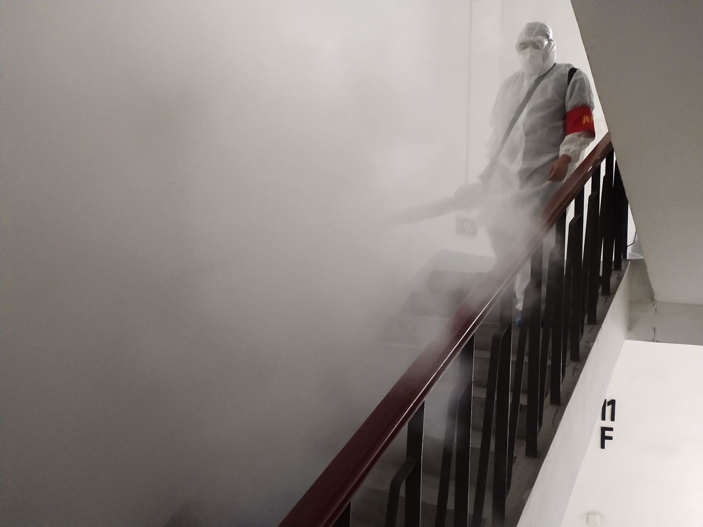 到达现场后,队员们做好个人防护,由两人一组进行分工,利用水雾烟雾机喷雾器和手动喷雾器进行作业,对酒店的大厅、电梯、走廊、扶手等部位进行全面消毒,做到不留死角,消杀彻底。进入酒店房间消杀作业的队员们,因知道是转运病人留下的空房间而略显紧张,在门口调了调背带的松紧后,仍然坚定的挥舞着手中的喷枪,让药剂在空气中弥漫。
