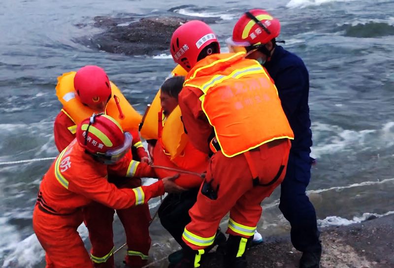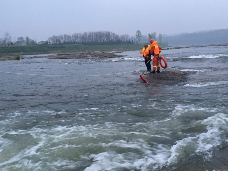消防救援人员赶到现场后,经观察发现,老人位于一块距离岸边约10米的礁石上,四周被河水包围,水流湍急,随时面临被水流卷走的危险。看着老人站在礁石上瑟瑟发抖,消防救援人员一边快速准备救援装备,一边向河中被困老人喊话,稳定老人的情绪。