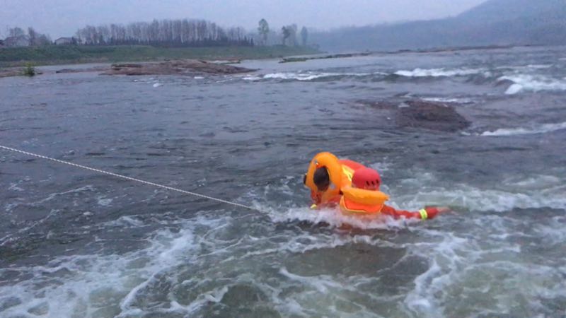 结合现场实际情况,指挥员立即制定救援方案,安排水性较好的消防员宁左夏涉水救援。宁左夏在做好个人防护后,携带救生衣、救生圈等救援装备涉水游向被困老人展开救援,岸上消防救援人员分两组牵引保护绳索,随时观察水情变化。
