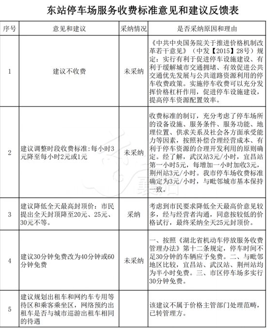 今年4月9号,市发改委就《襄阳东站停车场停车服务收费标准方案(征求意见稿)》向社会征求意见。按照规范管理、优化资源配置原则,用者付费、倡导绿色出行原则,累进加价、设置最高限额原则,科学合理、推进改革原则,《方案》提出推行“差别化停车服务收费政策”。收费标准为: