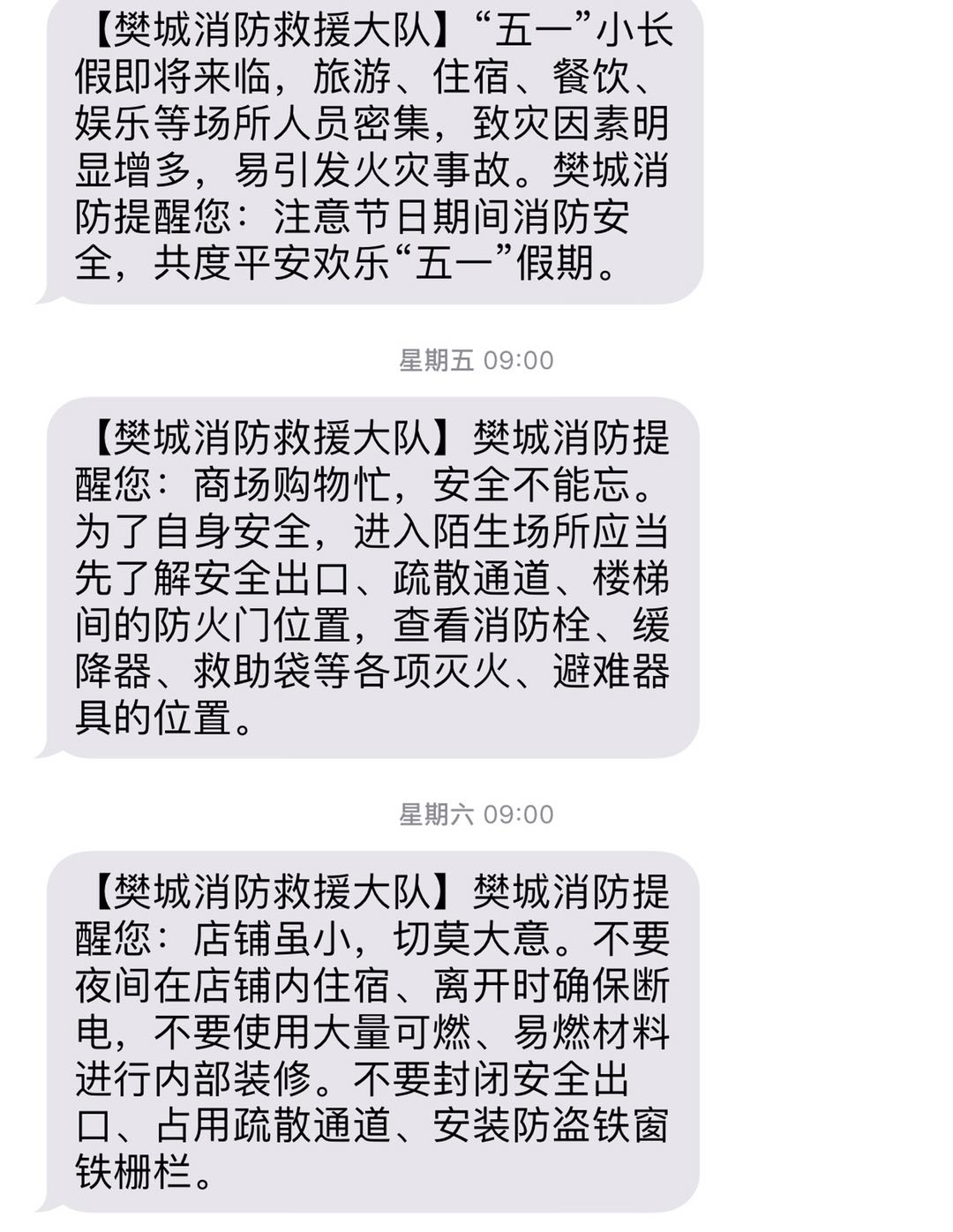 结合"五一"期间人流、物流增多的特点,樊城消防宣传小分队深入大型商市场、旅游景点、小区、"十小场所"向过往的群众发放宣传资料,利用消防宣传车进行错时宣传,高频次播放消防安全教育片、消防公益广告等内容。与此同时,樊城大队积极拓宽渠道,利用移动互联网短信平台向全市重点单位、旅游景区等目标人群推送针对性消防提示提醒,时刻警醒群众在劳动节期间切勿忽视消防安全。并利用广场、写字楼集中区、车站、景区等场所的大型LED显示屏、楼宇电视滚动播放消防安全公益广告和火灾案例警示教育片等小视频,激起民众学习消防、关注消防的浓厚兴趣。