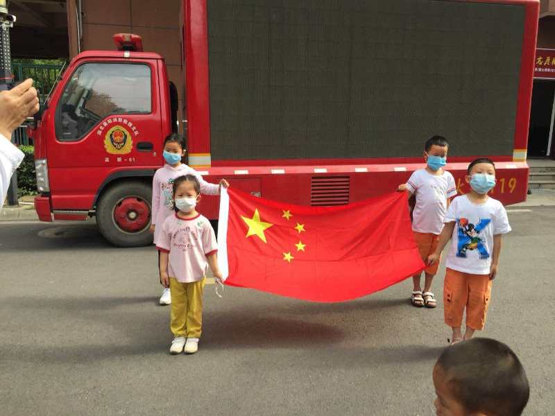 活动开始,全体小朋友们齐唱国歌,行注目礼。工作人员向孩子们讲解国旗的由来以及象征意义,让孩子们认识、了解国旗,在参与过程中培养、升华爱国情怀。随后,消防员细心地讲解了如何报警、校园防火、家庭防火以及火场逃生自救方法等基本消防安全知识, 并为现场的小朋友们耐心讲解了一些常用的消防器材性能、功能及用途,让孩子们零距离感受各类器材的使用。