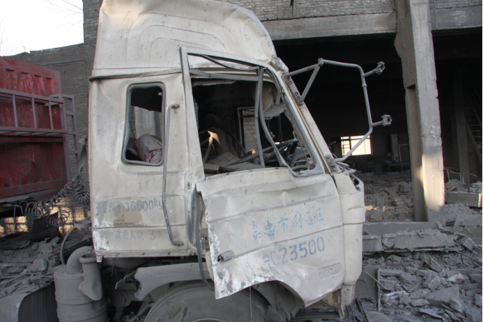 与之对比,自卸车辆燃烧痕迹明显,周围破损严重,厂房梁柱均有不同程度倒塌。所以,张相志推断爆炸点应该在装卸车附近。
