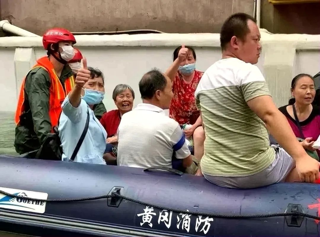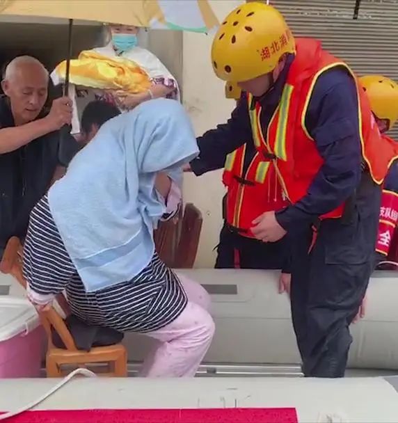 7月9日,黄石阳新县被困老人因左腿膝盖处截肢,瘫痪在床,眼看水位上涨情况危急,欧辉同志跪在橡皮艇上将盆内的老人一点点腾挪到了橡皮艇上,最终转移成功。这一跪,跪的是责任与担当。
