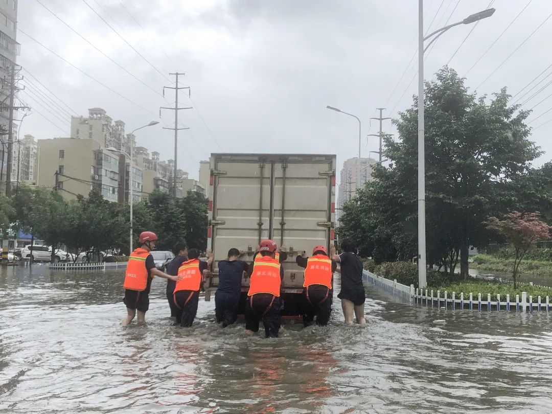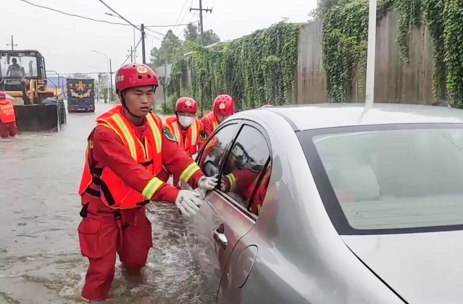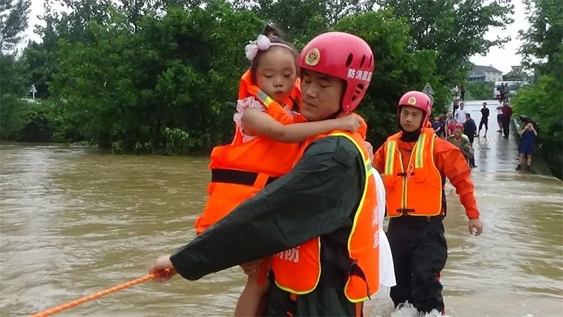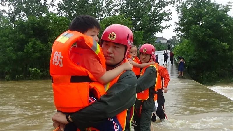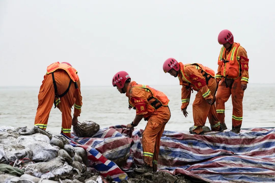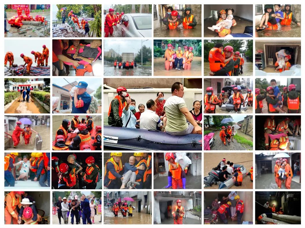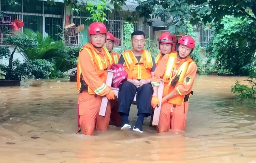 镶嵌着火焰蓝的橙色身影,如同渔灯一样在水光中传递信心与温暖。而洪流中不时收获的微笑,是这个汛期最有力量的表情。