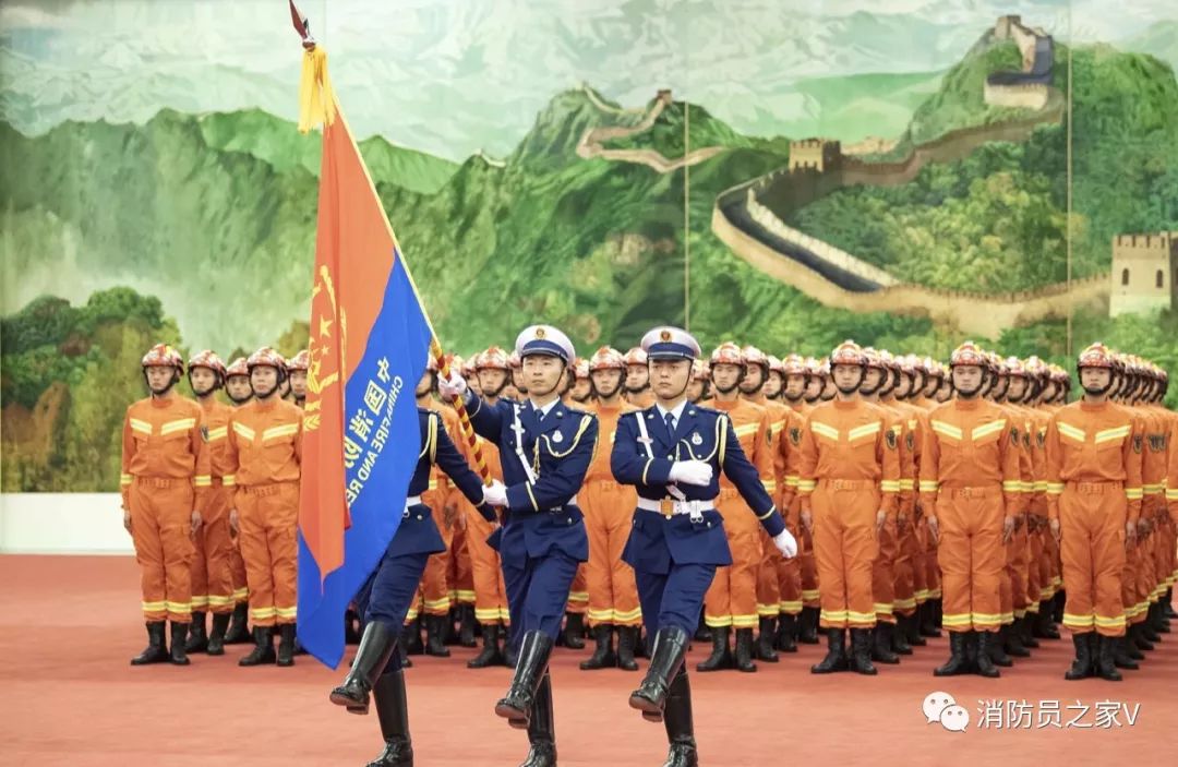 2018年3月21日:国务院改革方案通过提案,公安消防部队转制,与安全生产、武警森林等应急救援队伍一并作为综合性常备应急骨干力量,由新组建的应急管理部管理。 2018年10月9日:公安消防部队集体退役,成建制划归应急管理部,组建国家综合性消防救援队伍。 2018年11月9日:习近平总书记在人民大会堂向国家综合性消防救援队伍授旗并致训词,明确提出了“对党忠诚、纪律严明、赴汤蹈火、竭诚为民”的“四句话方针”。 2018年12月26日起:消防救援队伍授旗、授衔和换装、宣誓仪式在各省市隆重举行,这身叫做“火焰蓝”的制服,就带着使命和荣誉,走进了每个消防指战员的生命里。 2019年1月1日起:全国消防救援队伍车辆告别武警车辆号牌,消防车、指挥车(通信车)、应急车等统一悬挂应急车牌。