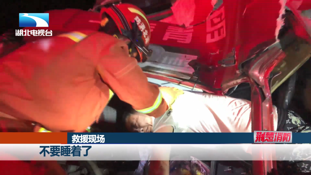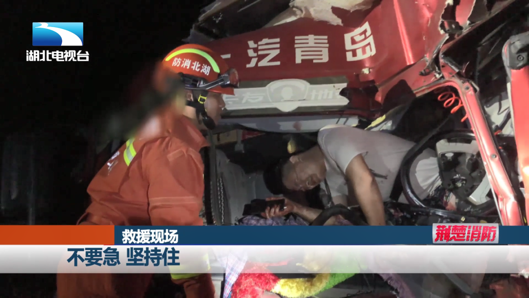 8月12号凌晨2点,京港澳高速孝感段,两辆大货车发生追尾事故,后车驾驶员被困。孝感市大悟县前进大道消防救援站的消防员迅速赶到现场,发现被追尾车辆侧翻在路边,另一辆大货车车头严重变形,驾驶员被困在驾驶室内,身体多处受伤。
