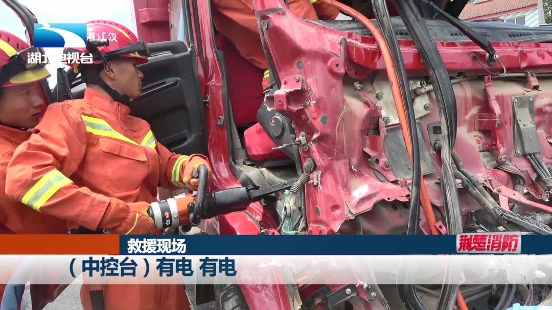 在潜江市浩口镇318国道,同样发生一起货车追尾事故。救援人员赶到现场后发现,追尾的小货车车头损毁严重,货车司机被中控台死死抵在座位上,腿部受伤流血。救援人员使用液压破拆工具组,从被困司机两侧同时开始扩张。变形的驾驶室里“暗藏”裸露的电线,稍有不慎就有触电的危险。