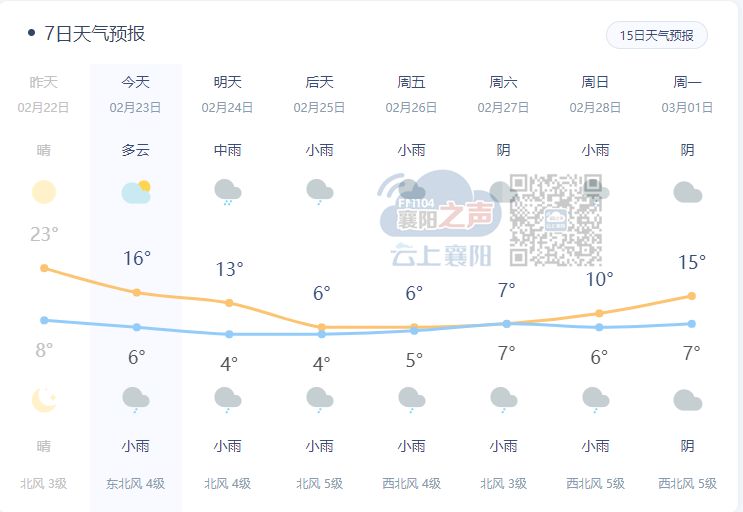 具体预报:襄阳23日下午到晚上:多云转小雨,偏北风3到4级,气温8到15度;24日:阴天有小到中雨,偏北风3-4级,阵风5-6级,气温4-7度;25日:阴天有小雨,偏北风4-5级,阵风6-7级,气温3-5级。