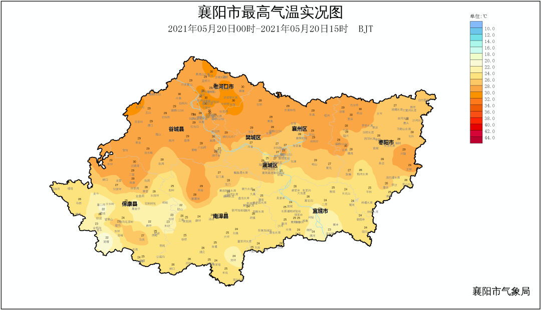 昨天,没有了雨水的干扰,气温攀升较快,襄阳大部地区最高气温在25℃,西部县市区热感明显一些,最高气温在27~29℃之间。