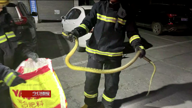 黄花蛇终于现身后,一名消防员眼疾手快地抓住蛇的七寸,展开一看,这条大蛇足有两米多长。随后,消防员将其放入事先准备好的蛇皮袋,带到野外放生。