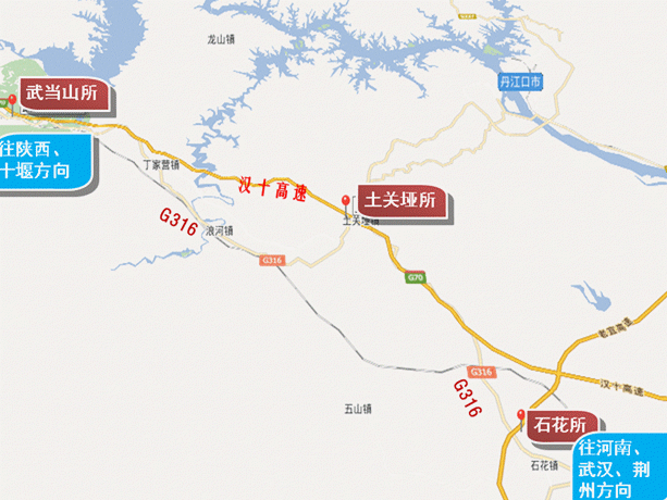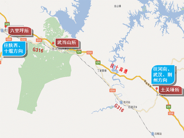 往陕西、十堰方向:沿兰福线(316国道)向西行驶至武当山收费站上高速,全程约31.9公里。如图所示。
