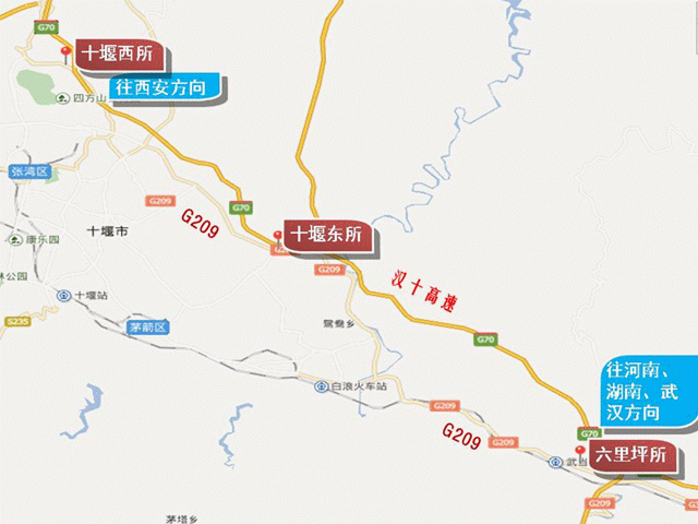 往西安方向:沿东环路(316国道)向西北行驶至十堰西收费站上高速,全程约10.3公里。如图所示。