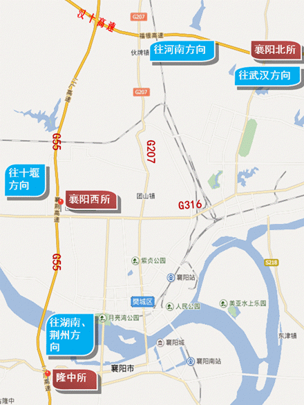 往河南、武汉、十堰方向:沿隆中路向东行驶至卧龙大道转邓城大道(316国道)至襄阳西收费站上高速,全程约15.8公里。如图所示。