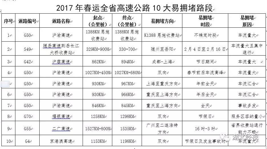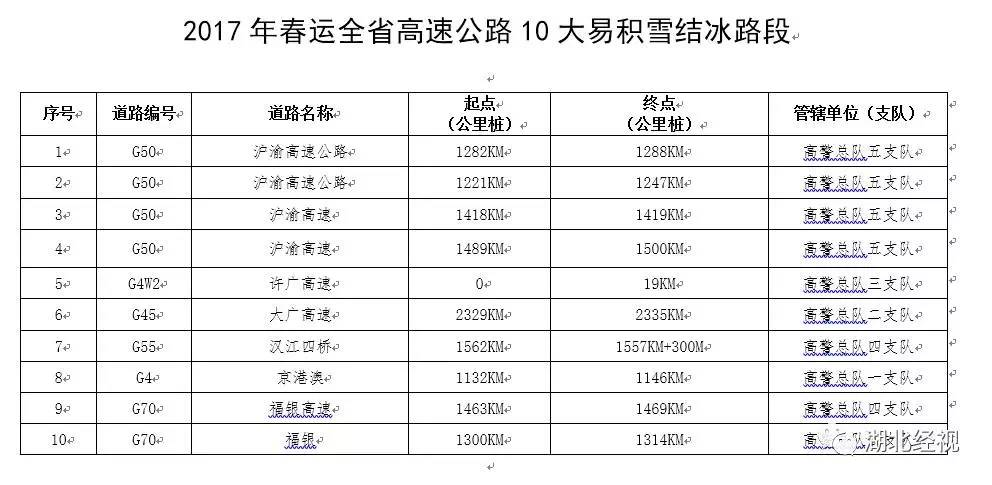 同时,省公安交管局公布了春运期间高速公路10大易积雪结冰路段、10大易拥堵路段分别为: