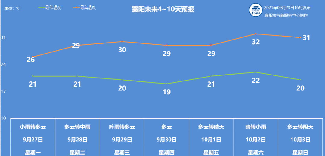 来看具体预报:襄阳今天下午到晚上:多云有阵雨,偏南风2到3级转3到4级,气温24到33度;明天:多云有阵雨;后天:多云有阵雨。