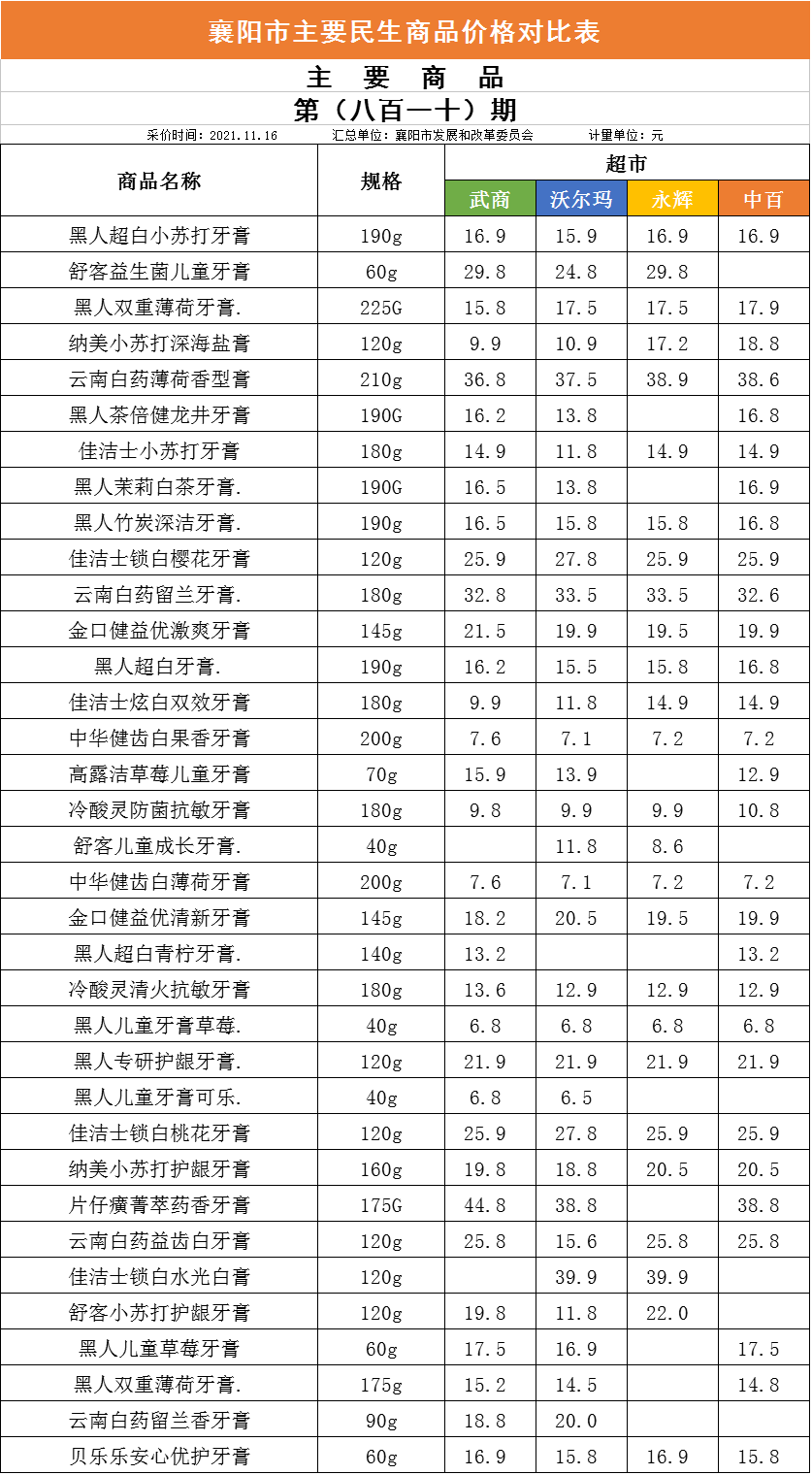 从超市间价格比对表可以看出,由于各大超市促销活动和促销产品不同等原因,造成同品种同规格的产品在不同超市存在价格差异。建议市民在选购时根据自身所需理性消费,价比三家,不妨多关注市发改委门户网站“价格监测”专栏以及“襄阳发改”微信公众号。