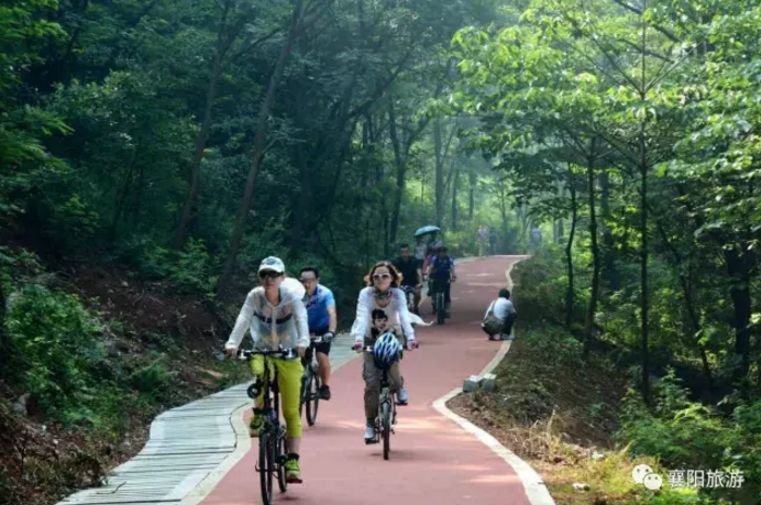 襄阳绿道岘山段全长6.8公里,有羊祜山、钓鱼洼两个环线,呈“8”字形,骑行爱好者可由烈士陵园广场、陵园路、翠屏山庄等处进入。建设者为了方便市民骑行,专门铺上了砖红色的防滑沥青,配合白色的交通标线,在周边树木植物衬映下,整体视觉效果鲜明醒目,大大增强了山路骑行的安全性。