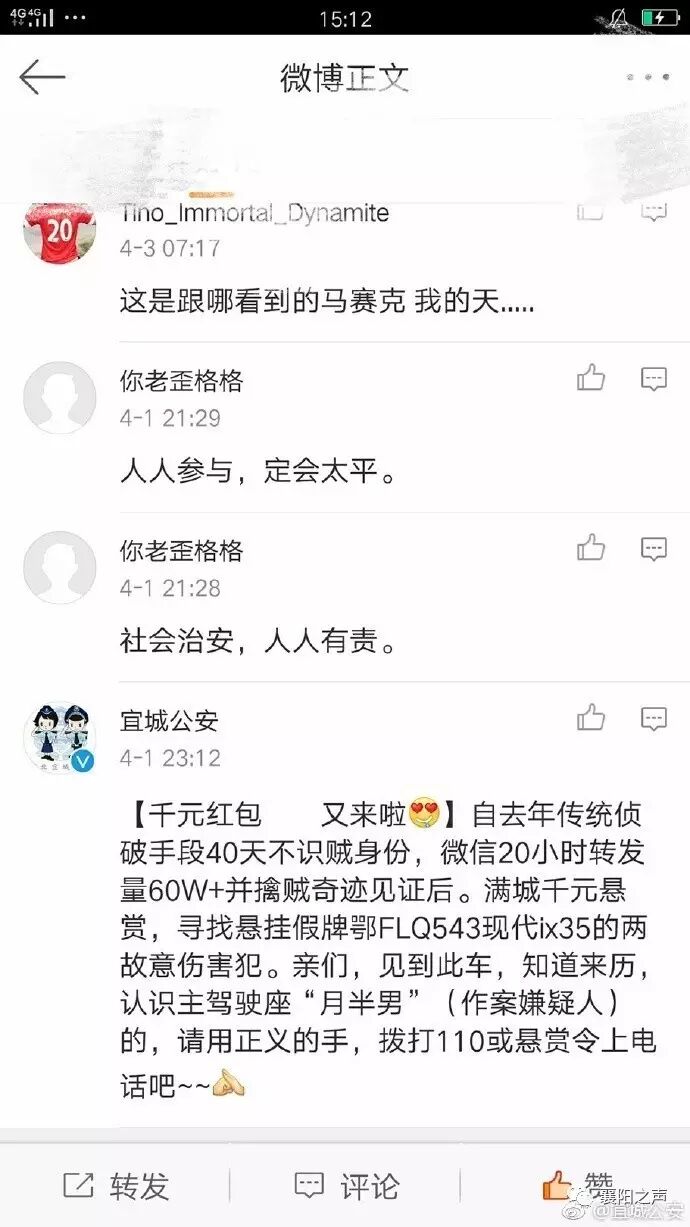 4月1日晚8时39分,宜城警方微博、微信发布悬赏通告,赏金500到1千元,满城悬赏悬挂假牌543的现代车和坐主驾驶座的“月半男”,呼吁市民提供线索。